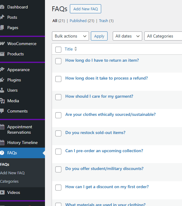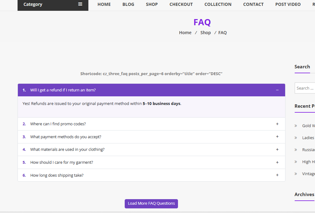 ‘post_type’ => ‘faq’ or ‘post’ or any other custom post type, ‘posts_per_page’ => number of posts to display per click, ‘category’ => category name , ‘orderby’ =>